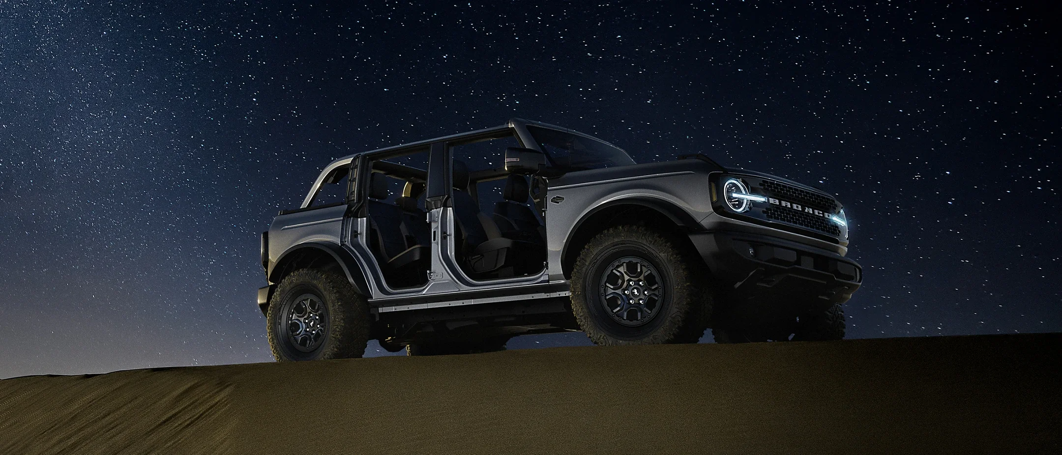 A selection of easy-to-remove doors and tops. Purposeful off-road design. Rugged hardware and components. Attachable tents, multi-functional roof racks and accessories. Wherever your journey calls, Bronco® SUV answers. Preproduction computer-generated image with optional equipment shown.